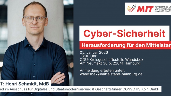 Wir als MIT Wandsbek laden Sie daher herzlich zu unserer Informations- und Diskussionsveranstaltung „Cyber-Sicherheit – Herausforderung für den Mittelstand“ ein. Als Gast und Experten...